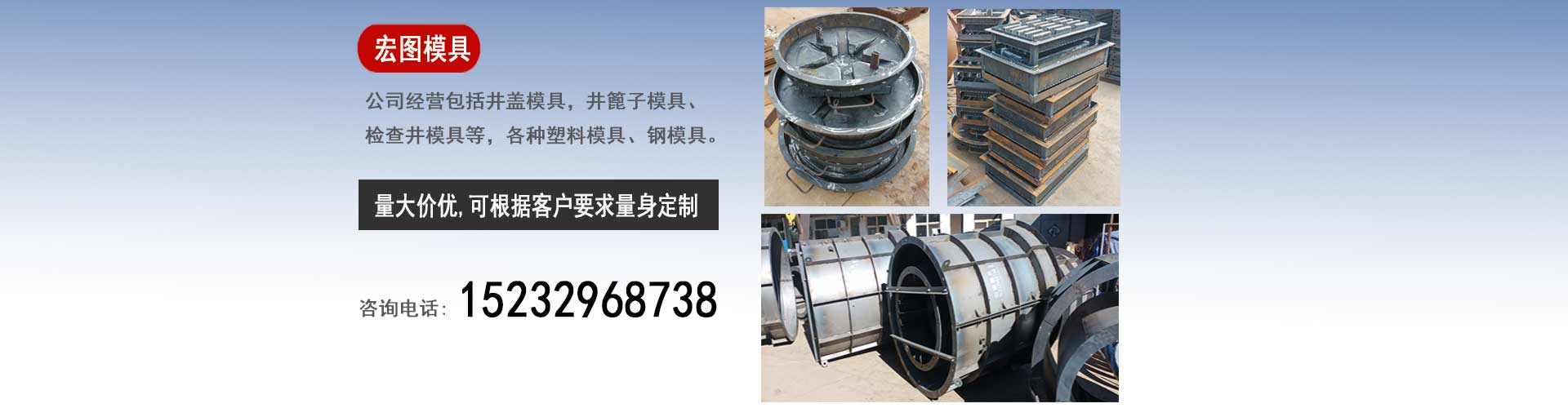保定宏圖檢查井蓋模具廠是一家集設(shè)計、研發(fā)、生產(chǎn)、銷售為一體的企業(yè),我廠主要經(jīng)營:水泥井蓋模具,預制井蓋塑料模具,下水井蓋鋼模具,雨水井篦子模具,排水井篦子塑料模具,污水井篦子鋼模具,混凝土檢查井模具,污水檢查井鋼模具等。我廠的賣的不僅僅是模具,更是一份保障,一份誠信,一份放心,我廠的銷售宗旨是"以誠信為本,做最好的模具,賣最便宜的價格"。保定宏圖檢查井蓋模具廠的模具產(chǎn)品銷往全國的30多個省市區(qū)及海外受到了廣大用戶的好評。